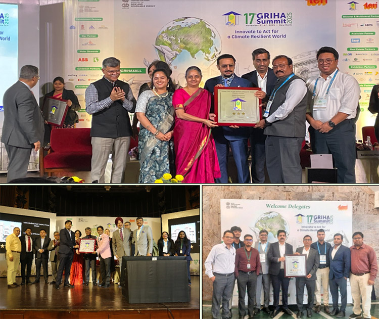 The 17th GRIHA Summit, held on 4–5 November 2025, marked a significant milestone in India’s journey toward sustainable development by celebrating exemplary achievements in the built environment. As a consulting partner, TERI played a pivotal role in guiding multiple projects toward green building excellence. Among the key recognitions, HUDCO HAL was awarded a 3-Star rating under GRIHA Large Developments (LD), reflecting strong adherence to sustainability principles. Additionally, the Rural Electrification Corporation Limited (REC) office in Gurugram, InterGlobe Education Services Limited, Greater Noida, and InterGlobe Real Estate Ventures Private Limited, Gurugram achieved prestigious 5-Star GRIHA ratings. Notably, the InterGlobe projects in Greater Noida and Gurugram were recognized for their sustainable upgrades under the GRIHA Existing Building recertification framework.